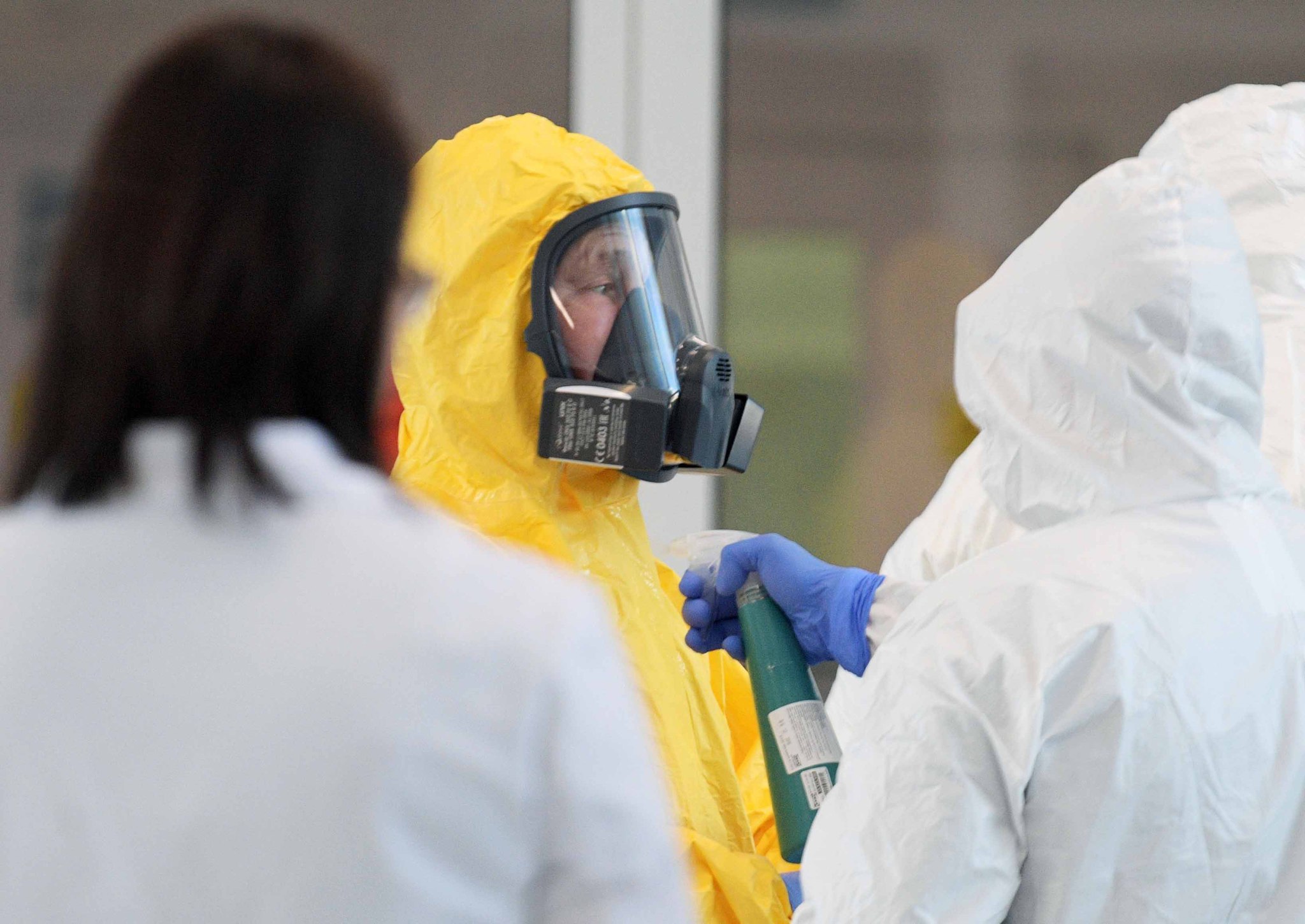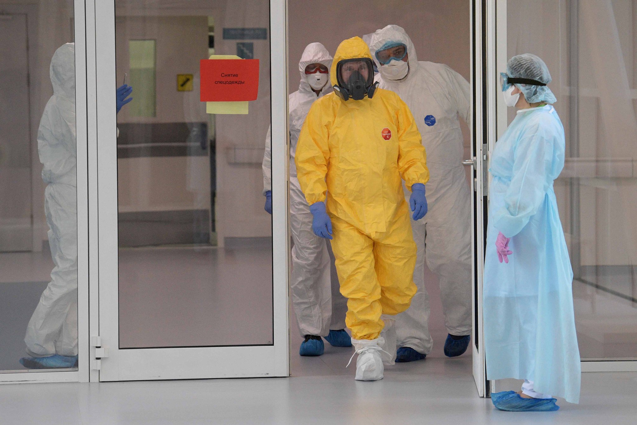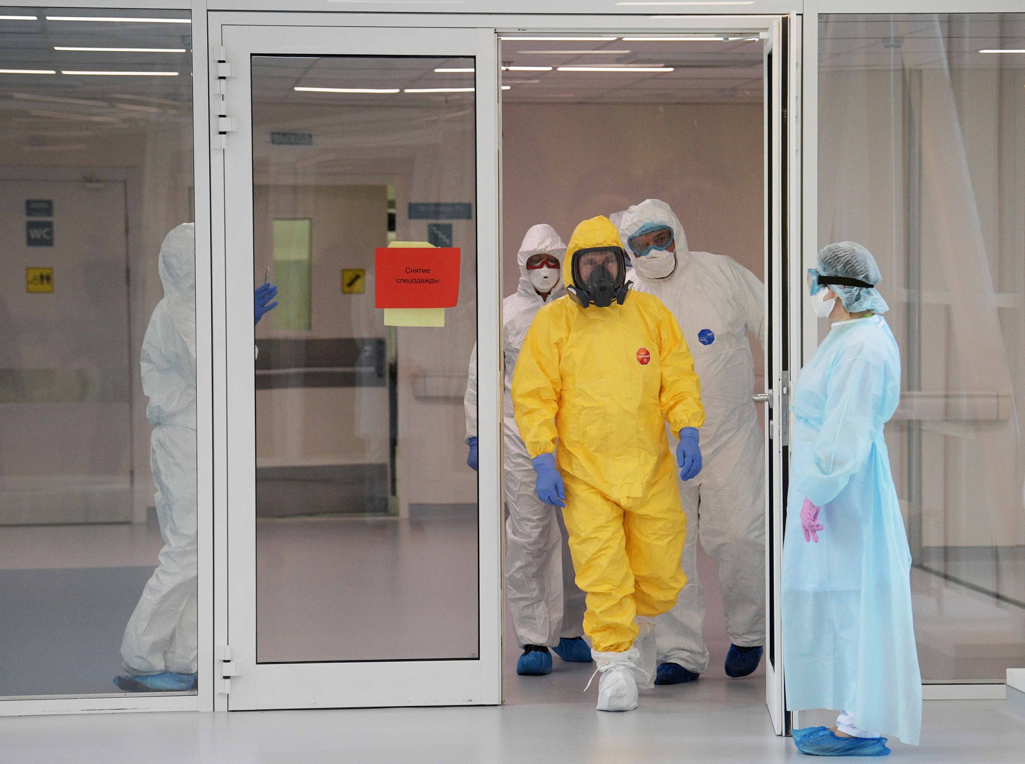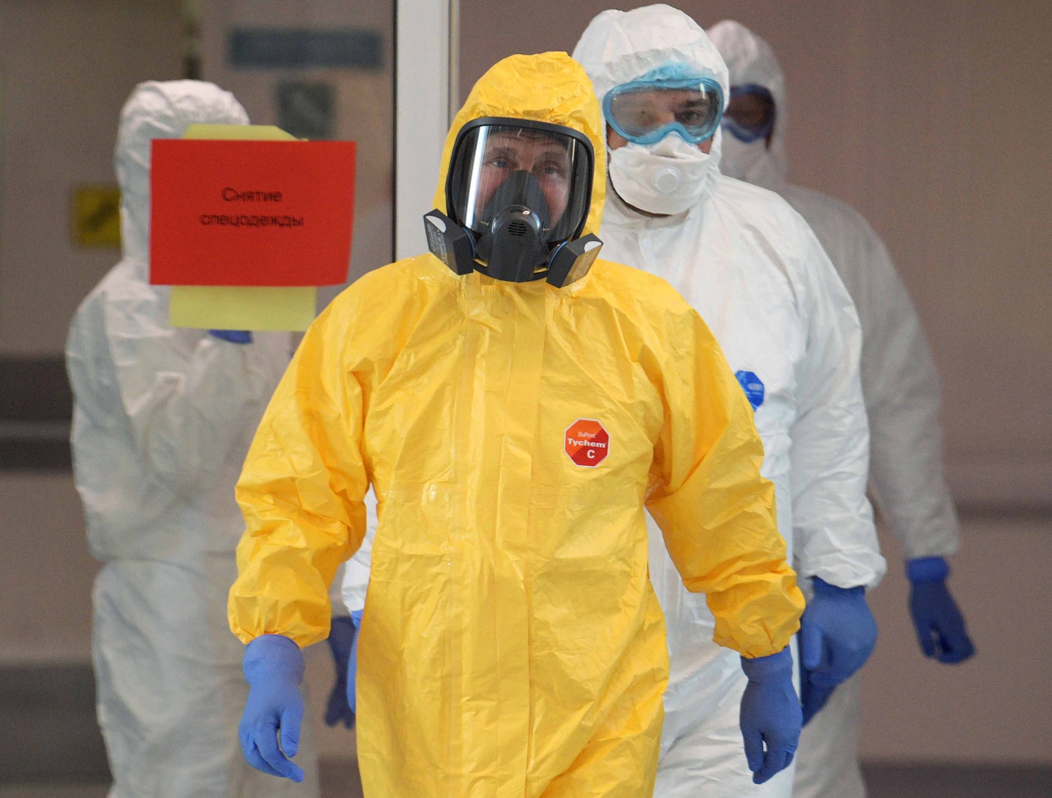 Hastane personeli ile etrafı çevrelenen Putin, sarı renkli koruyucu kıyafetini giydi ve hastaların olduğu alana girmeden önce solunum cihazı takıldı.
