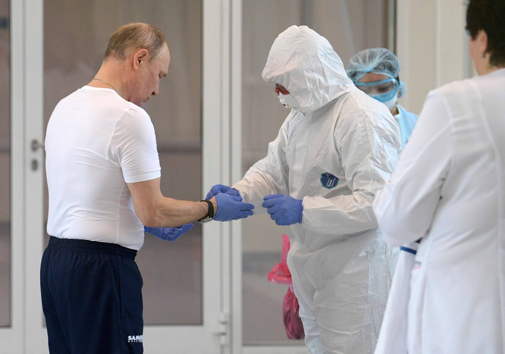 Hastanenin en riskli yerine girmeden önce ise Putin'e bir çift koruyucu plastik bot ve mavi eldiven verildi.