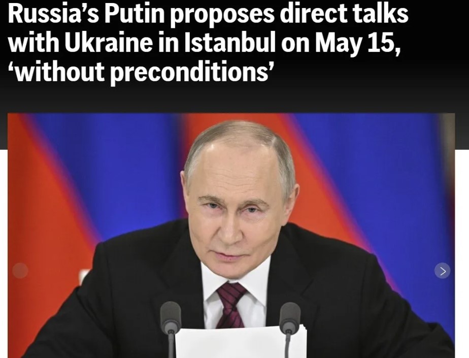 Rusya Devlet Başkanı Vladimir Putin, üç yılı aşkın süredir devam eden Ukrayna savaşına çözüm bulmak amacıyla, 15 Mayıs'ta İstanbul'da Ukrayna ile doğrudan ve ön koşulsuz barış görüşmeleri yapılmasını önerdi.