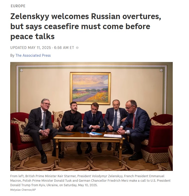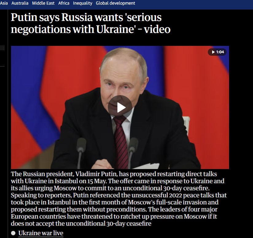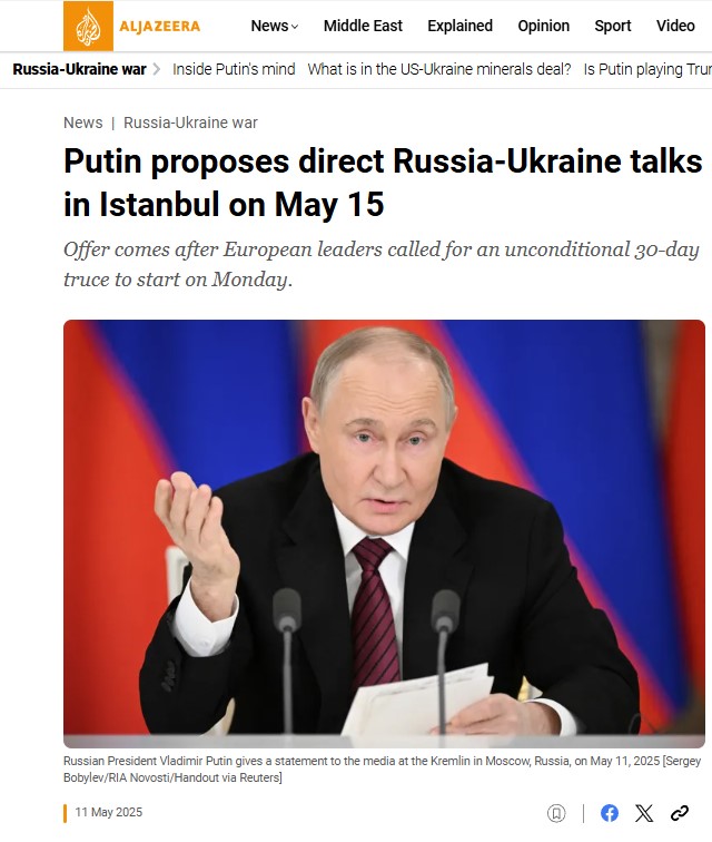 Al Jazeera, Putin'in 15 Mayıs'ta İstanbul'da Ukrayna ile doğrudan görüşme önerisinde bulunduğunu ve bu teklifin, Avrupa liderlerinin 30 günlük koşulsuz ateşkes çağrısının ardından geldiğini belirtti.