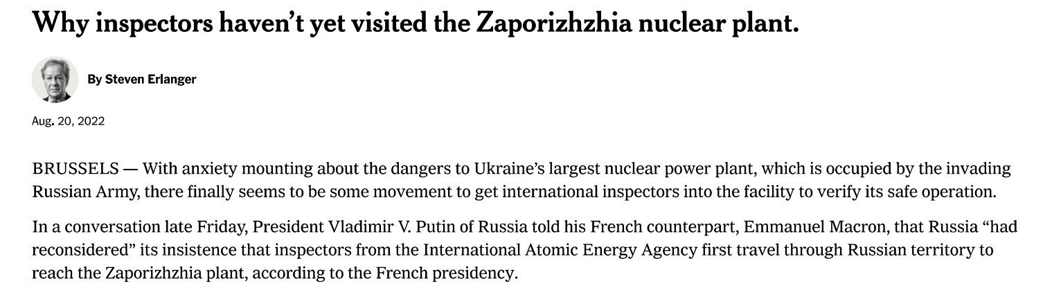 Fransa Cumhurbaşkanlığından yapılan açıklamaya göre Rusya Devlet Başkanı Vladimir V. Putin cuma geç saatlerde Fransa Cumhurbaşkanı Emmanuel Macron ile yaptığı görüşmede Rusya'nın Uluslararası Atom Enerjisi Kurumundan müfettişlerin Zaporijya santraline gitmek için önce Rus topraklarından geçmesi yönündeki ısrarını "yeniden değerlendirdiğini" söyledi.