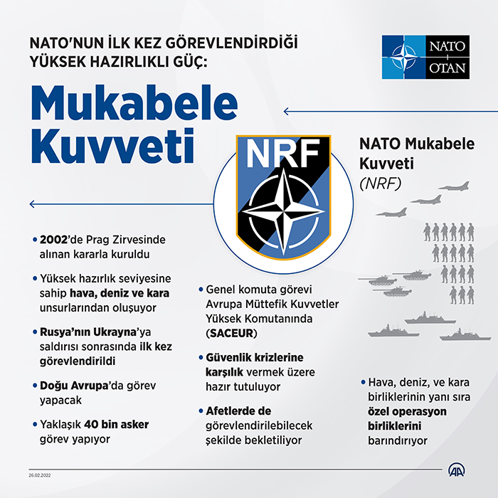 Rusya'nın Ukrayna'ya saldırısı sonrasında NATO'nun ilk kez toplu savunma kapsamında harekete geçirdiği NATO Mukabele Kuvveti (NRF), yaklaşık 40 bin askerden oluşan ve krizlere hızlı karşılık verme imkanına sahip çok uluslu güç olarak biliniyor.
