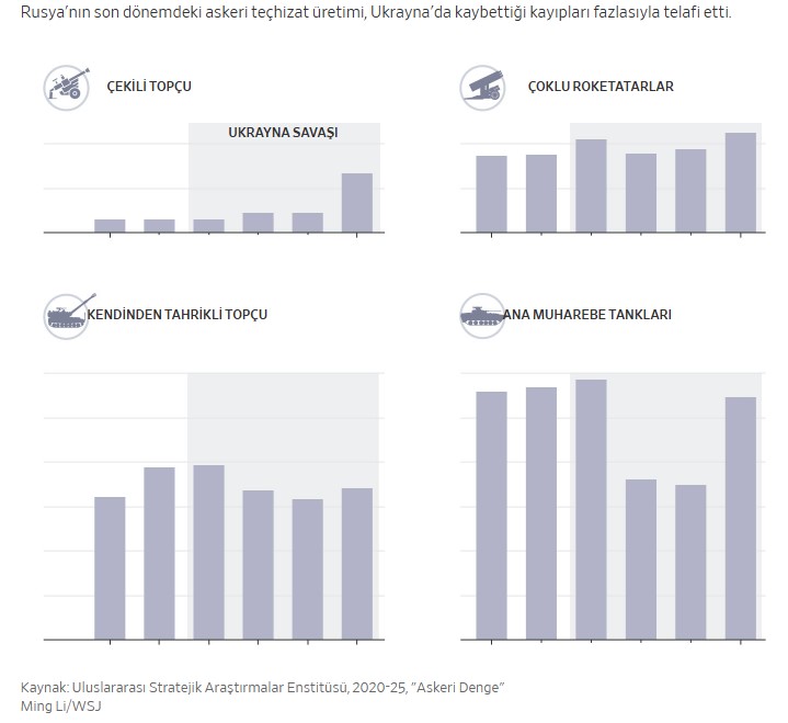 Rusya'nın askeri üretim kapasitesi de gözle görülür biçimde büyüdü. WSJ'nin aktardığına göre, 2021'de yılda yaklaşık 40 adet üretilen T-90M ana muharebe tanklarının üretimi, bugün yılda 300 adede fırlamış durumda.