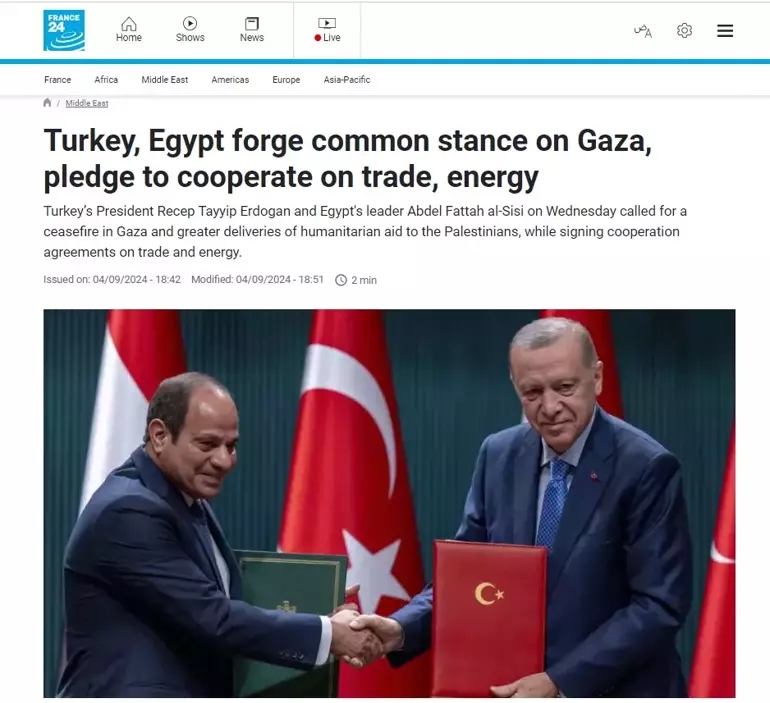 France24, Türkiye ve Mısır'ın Gazze konusunda ortak bir tavır benimsediğini vurguladığı haberinde iki ülke arasındaki ilişkilerin İsrail'in Gazze'ye yönelik saldırıları sonrasında daha da ısındığını yazdı ve "Her iki lider de Gazze'de ateşkes çağrısında bulundu ve kuşatma altındaki Filistin halkına daha fazla insani yardım ulaştırılması gerektiğini söyledi" ifadelerini kullandı.
