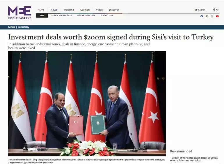 Mısır Cumhurbaşkanı Sisi, Başkan Erdoğan'ın Mısır ziyareti sonrası iade-i ziyarette bulundu. Sisi'nin Türkiye'ye yaptığı ziyaret dünya basınında da geniş yer buldu. Mısır ile Türkiye arasında yeni bir dönemin başladığına vurgu yapılırken, Erdoğan ile Sisi'nin Gazze konusunda ortak bir görüş belirlediğine dikkat çekildi.
