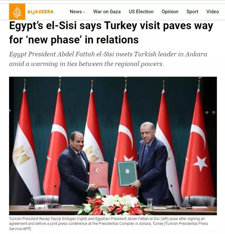 Mısır Cumhurbaşkanı Abdulfettah es-Sisi'nin, kendi ülkesi gibi bölgesel bir güç olan Türkiye ile bağların yeniden inşası için Ankara'ya gittiğini yazan Al Jazeera ziyaretin 12 yıl sonra bir ilk olduğuna dikkat çekti. Sisi'nin "Türkiye ziyaretim ekonomik ve ticari ilişkilerde yeni bir aşamaya öncülük ediyor" açıklamasına dikkat çeken Al Jazeera iki ülke arasında 17 anlaşmanın imzalandığını yazdı.