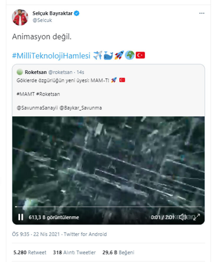 Baykar Teknoloji lideri Selçuk Bayraktar, Roketsan'ın yayınladığı test videosunu retweet edip "Animasyon değil" mesajını yazdı.