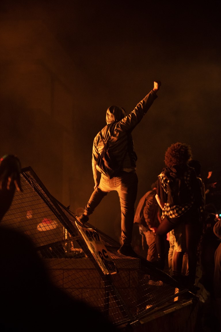 Eylemciler, güvenlik güçleriyle karşı karşıya gelirken, Minneapolis Polis Merkezi'nin girişini ateşe verdi. Protestoların üçüncü gününde, göstericiler ve polis geç saatlere kadar çatıştı. İşyerlerini ateşe veren göstericiler polis arabalarını da taşladı.