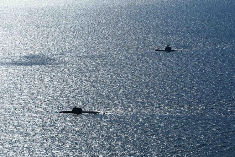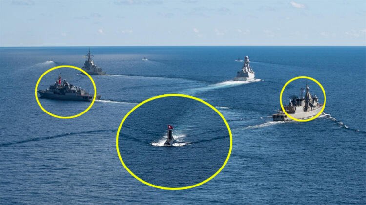 Fotoğraflarda Doğu Akdeniz'de birbirlerine meydan okuyan Türk ve Yunan savaş gemilerinin birlikte manevra yaptığı, denizaltıların da yine birlikte hareket ettiği görüldü.