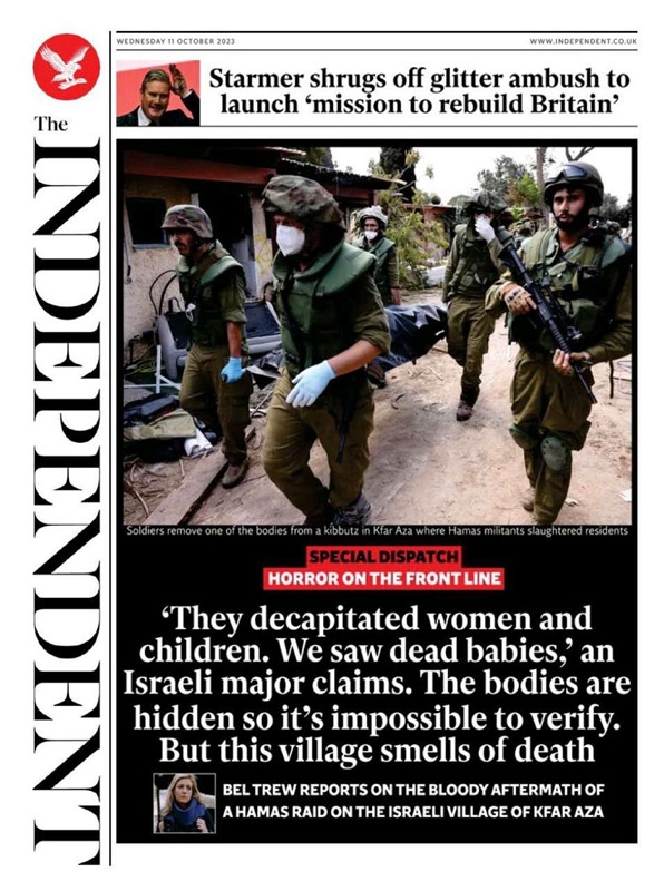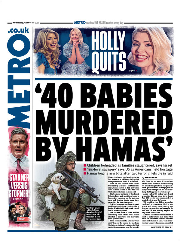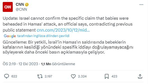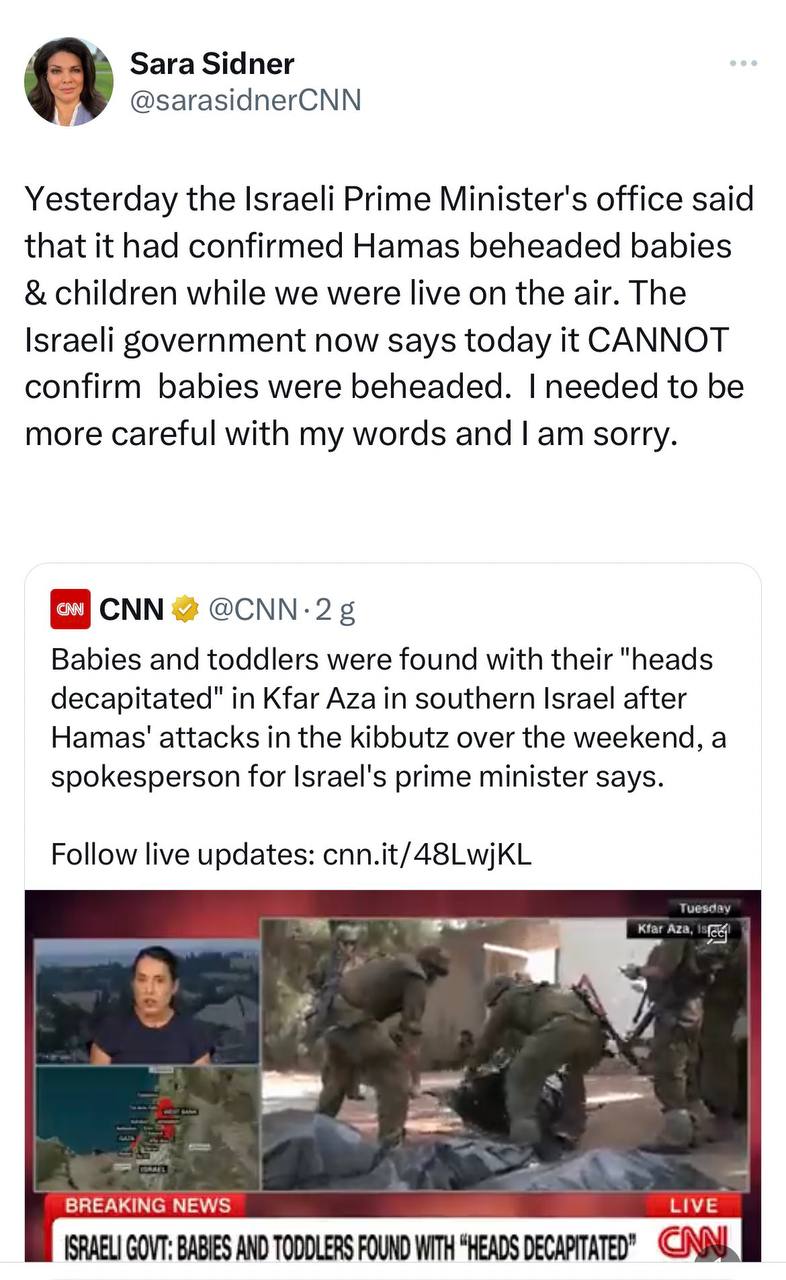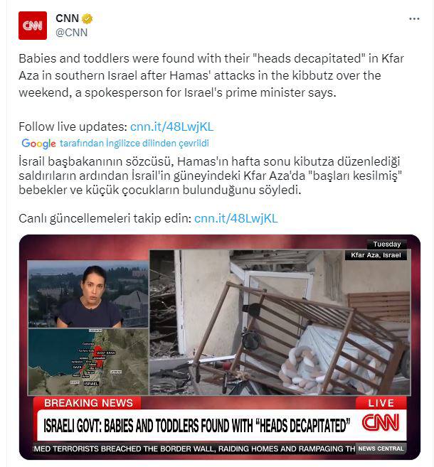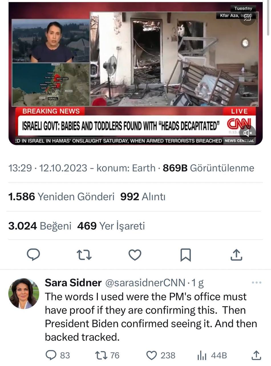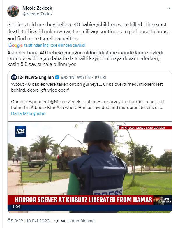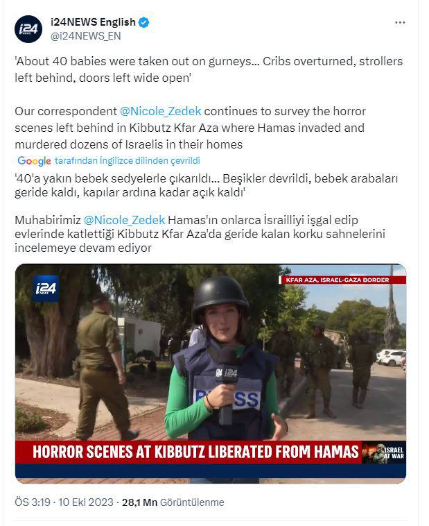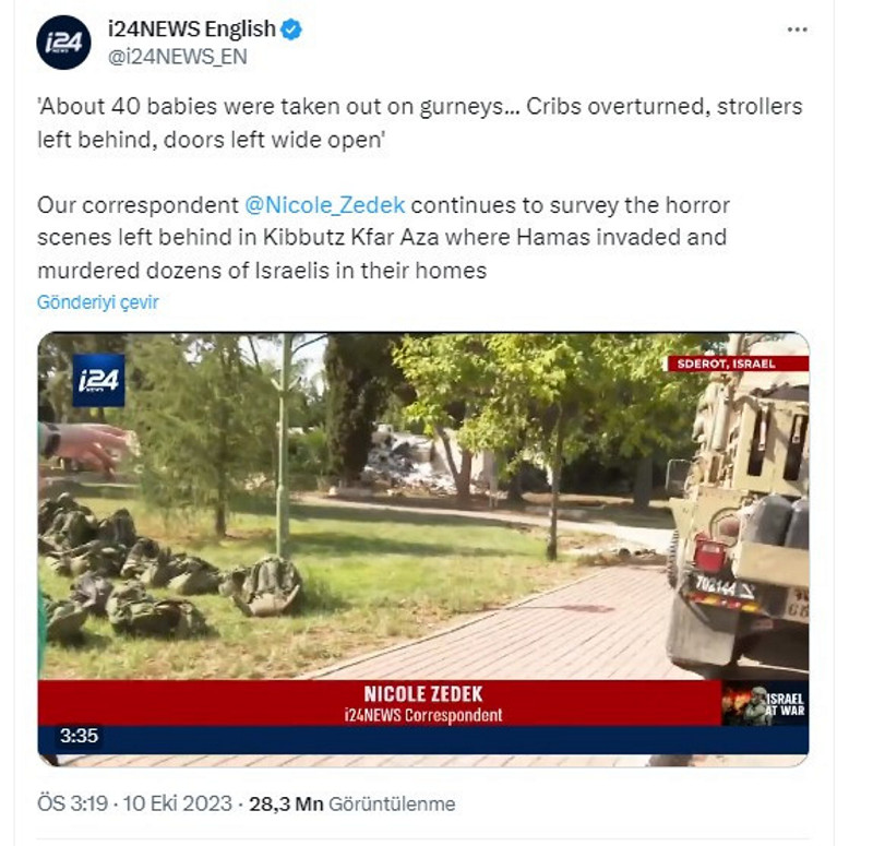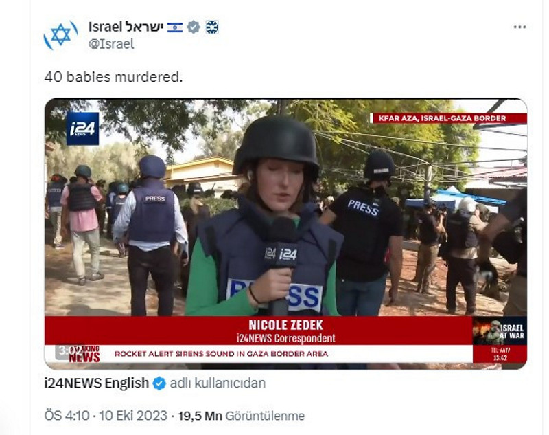 İşgalci İsrail hükümetine yakın İ24News televizyonu, 10 Ekim'de 15.19'da "40 İsrailli bebek Hamas tarafından kafaları kesilerek öldürüldü" yalanını servis etti.