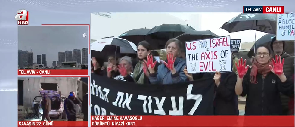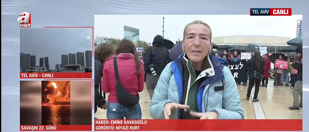 İsrail'in başkenti Tel Aviv'de tansiyonun bir an bile düşmediği ateş hattından bildiren A Haber Programlar Müdürü Emine Kavasoğlu protestoların örgütlü bir şekilde başladığını belirterek, "Bir protesto gösterisi için bir hafta önceden toplanma çağrısı yapılmıştı ve şu anda da o protesto gösterisi Habima Meydanı'nda başlamış durumda" ifadelerini kullandı.