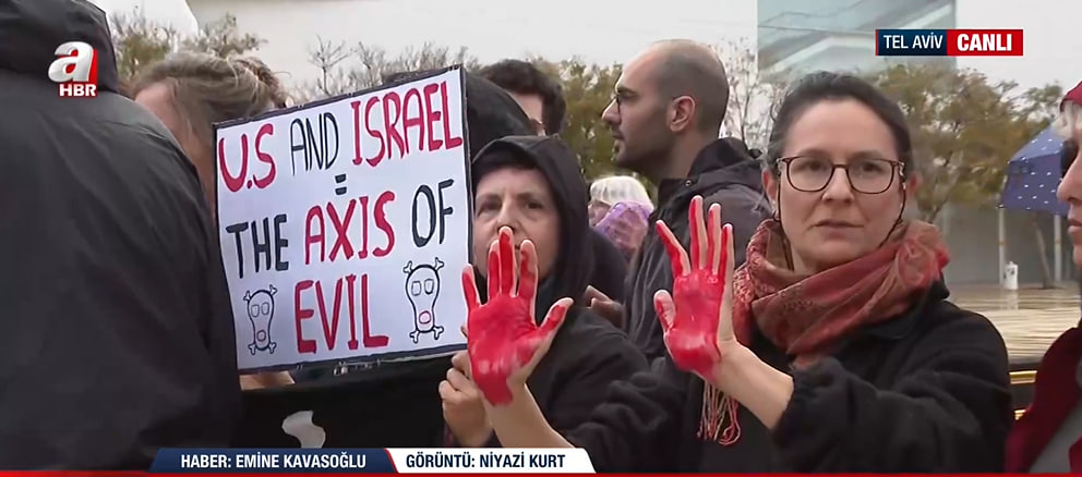 Meydandaki eylemcilerin görsel bir protesto yaptığını ve doğrudan Başbakan Netanyahu'yu hedef aldığını vurgulayan Emine Kavasoğlu, "Kimi ellerini kırmızı renge boyamış, kanlı elleriyle Netanyahu'yu protesto ediyorlar; ellerinin kanlı olduğunu söyleyerek protesto ediyorlar" şeklinde konuştu. Meydandaki pankartların içeriğine dikkat çeken Kavasoğlu, "Bir yandan da 'Soykırımı durdurun', 'Soykırımı saklayamazsınız' pankartları taşıyorlar. Amerika ve İsrail'i şeytan olarak tasvir etmişler ve 'Kim Filistinlileri İsrail'in takıntısından koruyacak?' pankartları var" detaylarını paylaştı.