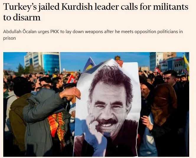 Financial Times, tarihi gelişmeyi ilk sıradan duyurdu. Öcalan'ın PKK için yaptığı silah bırakma çağrısının ayrıntılarına yer veren FT, "Bu çağrı Türkiye'nin yirmi yıldan uzun süredir lideri olan Erdoğan için büyük bir siyasi başarıyı işaret ediyor" ifadelerine yer verdi.