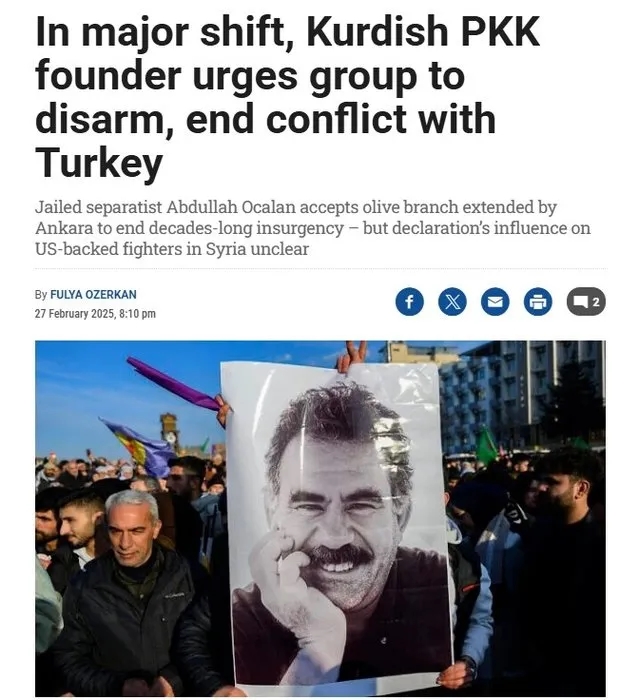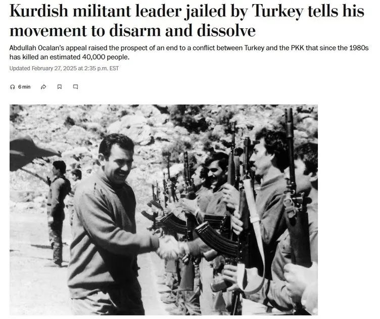 ABD'li The New York Times, teröristbaşı Öcalan'ın çağrısını, "Kürt isyancı örgütü PKK'nın lideri Abdullah Öcalan, savaşçılarına silah bırakma çağrısı yaptı" sözleriyle manşete taşıdı. NYT, haberinde bu çağrının sonuçlarına yönelik şu ifadeleri kullandı: "PKK'nın silah bırakması, Türkiye'nin en uzun süredir devam eden iç güvenlik tehdidinin çözülmesi anlamına gelecek ve Cumhurbaşkanı Recep Tayyip Erdoğan açısından önemli bir siyasi başarıya işaret edecektir."