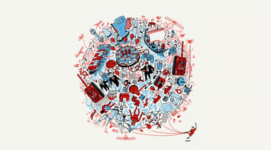 Liderlerin yanı sıra, çok sayıda robot, savaş teçhizatları, aşı şırıngaları, ticari gemilerin bir dünya küresinde olduğu, bir futbol oyuncusu tarafından dünyaya şut çekildiği tasarımı yer alıyor.