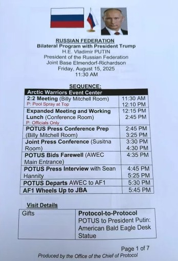 Basılı paketin ilk sayfasında, 15 Ağustos'taki toplantıların sıralaması, Anchorage'daki üssün içindeki odaların isimleri de dahil olmak üzere açıklandı. Ayrıca, Trump'ın Putin'e törensel bir hediye vermeyi planladığı da ortaya çıktı.
