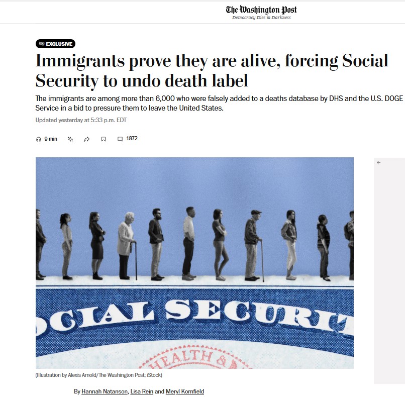 Hükümetin, Sosyal Güvenlik'in "Ölüm Ana Dosyası" (Death Master File) adı verilen sistemine 6.161 göçmenin ismini bizzat kaydettiği ve bunun DHS Sekreteri Kristi L. Noem tarafından imzalanan resmi protokollerle gerçekleştirildiği ortaya çıktı.