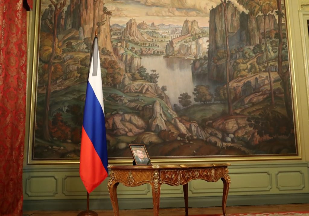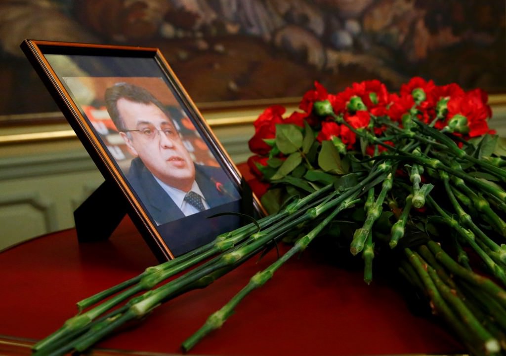 Salonun girişindeki masanın üzerine suikasta uğrayan Rusya'nın Ankara Büyükelçisi Andrey Karlov'un fotoğrafı konuldu.
