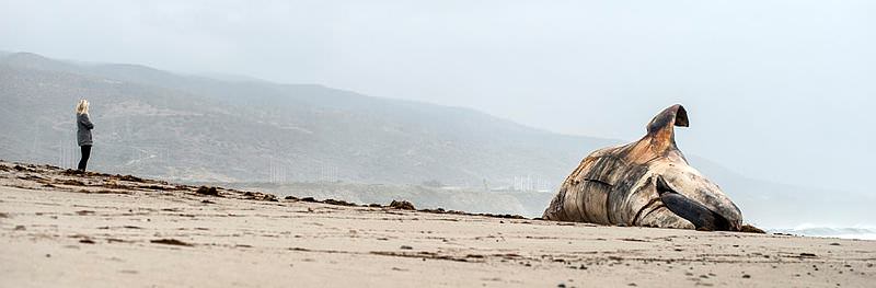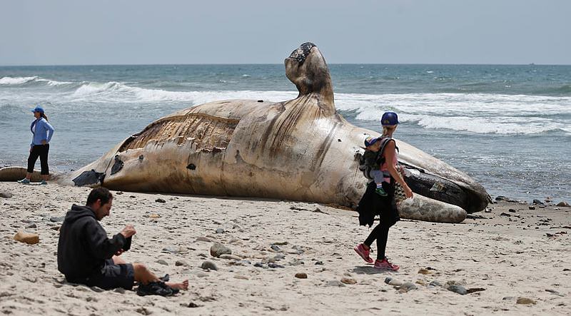 Kaliforniya'nın ünlü sörf merkezi San Onofre'de tonlarca ağırlıktaki balina ölüsü kıyıya vurdu.