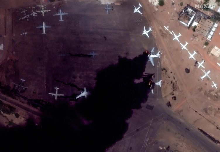 Uydu görüntüleri ise felaketin boyutunu gözler önüne serdi. Görüntülerde Sudan Uluslararası Havalimanı'nda yanan uçaklar görülüyor.