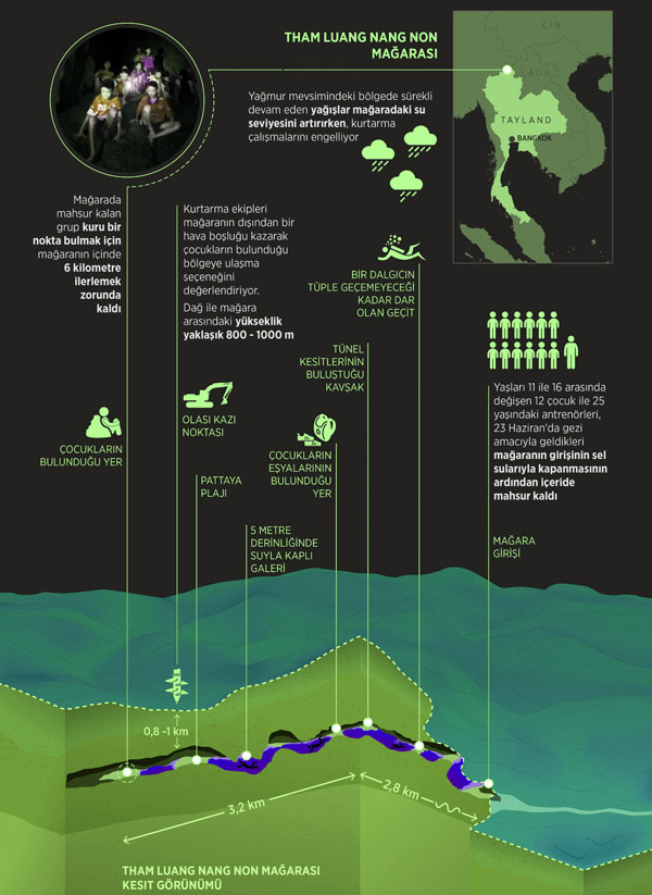 Mağaraya 13'ü yabancı 5'i Tayland donanmasından 18 dalgıç girdi. Çocuklar mağaradan birer birer çıkartılacak. Her çocuğa iki dalgıç eşlik edecek.