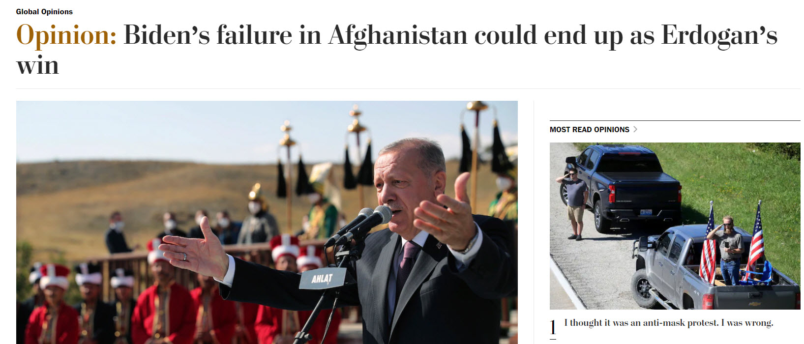ABD'nin önde gelen gazetelerinden Washington Post, dünyanın dikkatle takip ettiği Afganistan'daki gelişmelere yer verdi. ABD Başkanı Biden'ın Afganistan'da başarısız olduğunu yazan gazete Başkan Recep Tayyip Erdoğan'dan övgüyle bahsetti. Washington Post'ta yer alan haberde, "Biden'ın Afganistan'daki başarısızlığı Erdoğan'ın kazanmasıyla sonuçlanabilir" ifadelerine yer verildi.