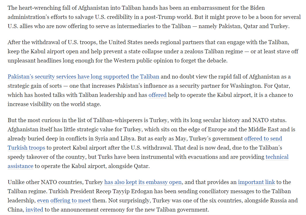 ABD birliklerinin geri çekilmesinden sonra, ABD'nin Taliban ile ilişki kurabilecek, Kabil havaalanını açık tutabilecek ve Taliban rejimi altında bir devletin çöküşünü önlemeye yardımcı olabilecek bölgesel ortaklara ihtiyacı var. En azından Batı kamuoyunun bu fiyaskoyu unutması için zaman kazanmak isteyecektir.