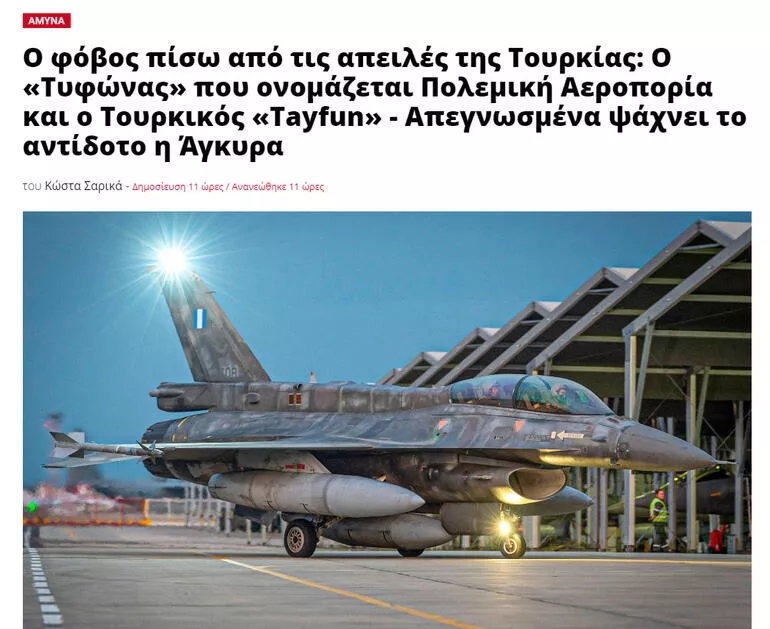 Provokatif haberleriyle bilinen internet sitesi, "Türk basını Tayfun Tanagra ve hatta Araxos ile Andravida hava üslerine bile ulaşıyor" diye yazdı, 'Yunan şahinleri' diye tanımladığı savaş uçaklarının Türklerin ilk hedefi olduğunu ileri sürdü. newpost.gr'nin haberine göre, Türkiye Yunan jetlerini henüz havalanmadan 'yuvalarında' vurmanın batı komşusunu nakavt etmenin tek yolu olduğunu biliyor.