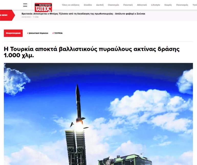Yunan Eleftheros Typos gazetesi ise, 'Türkiye 1000 kilometre menzilli balistik füze elde ediyor' başlıklı haberinde yerli üretim Tayfun'un 500 kilometreden fazla mesafedeki hedefi paramparça ettiğini, şimdi İyon adaları dahil bütün Yunanistan'ı vurma kapasitesine sahip olduğunu yazdı.