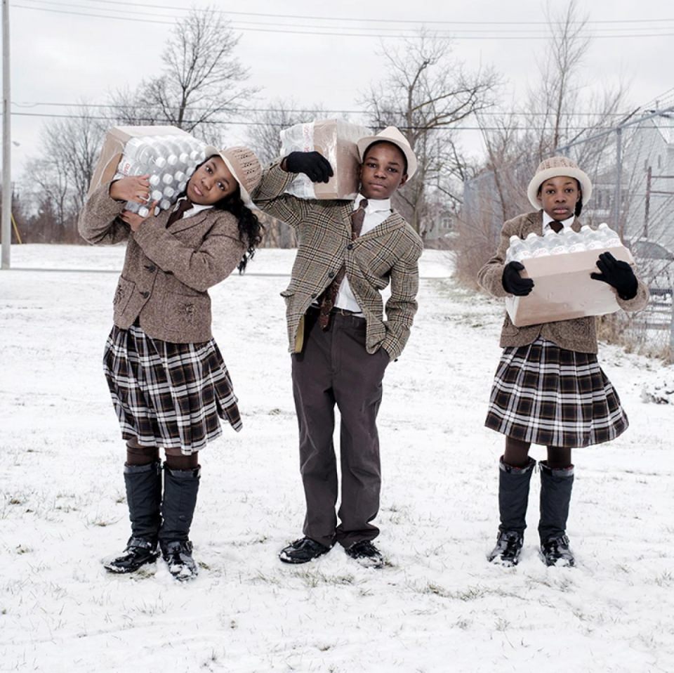 Michigan'da Julie, Antonio ve India Abram kardeşler, günlük olarak su ihtiyacının karşılandığı yangın istasyonundan şişelenmiş suları topluyor.