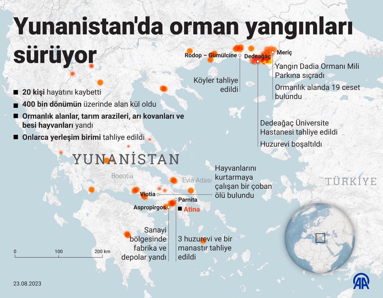 Dedeağaç'ta 19 Ağustos'ta başlayan orman yangınları Meriç'e ve Rodop'a da sıçradı. Meriç ve Dedeağaç'ta çok sayıda yerleşim birimi yangından etkilendi.