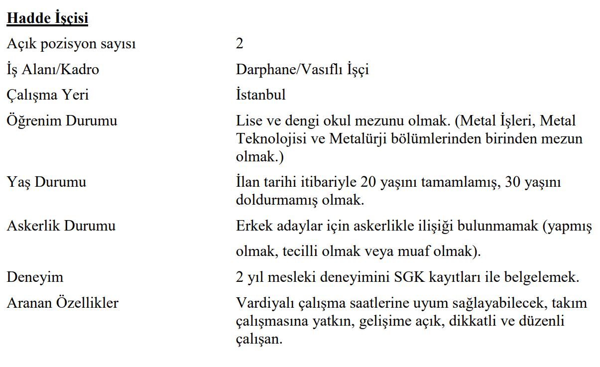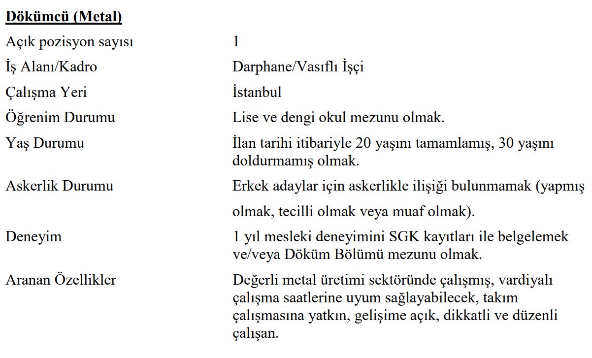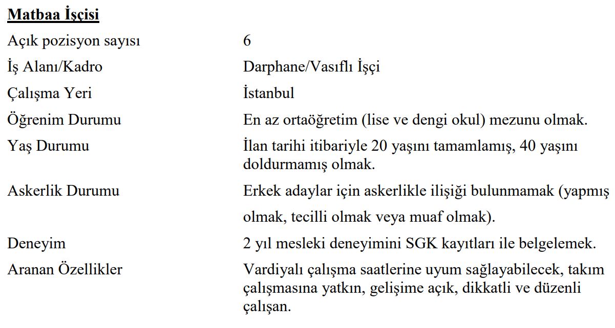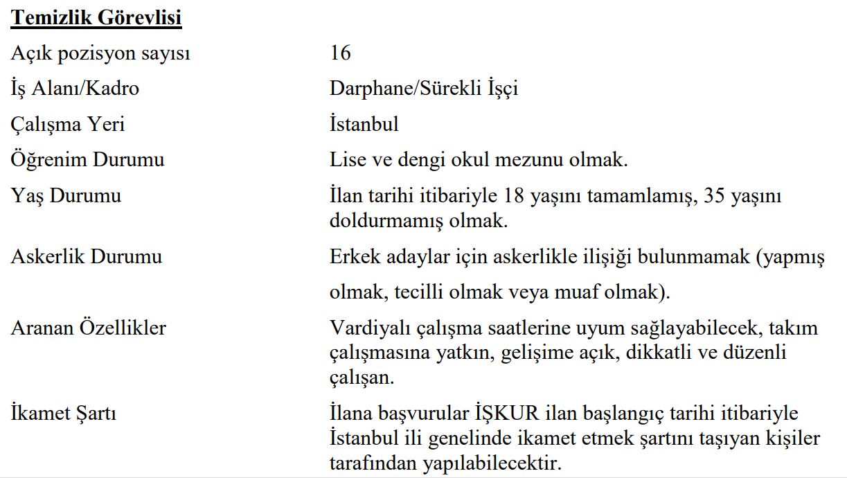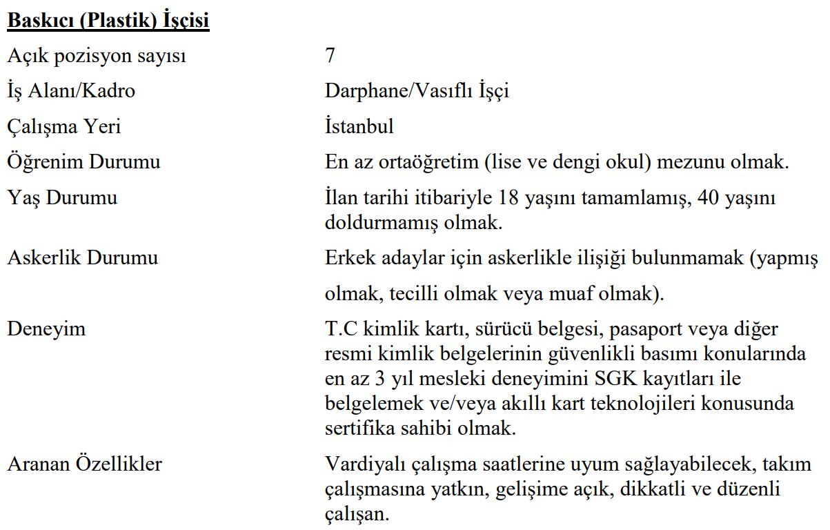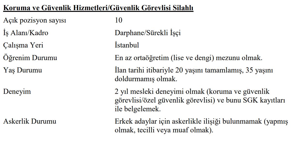 Türkiye İş Kurumu (İŞKUR) üzerinden alımı gerçek işçi alımına en az ilköğretim mezunu adaylar başvuruda bulunabilecek. Başvuru şartları ve tarihine ilişkin detayların belli olduğu ilan kapsamında ise hiçbir kadro için KPSS puan şartı aranmıyor. İşte Darphane personel alımı kadro ve şartları…
