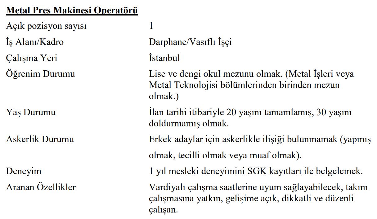 Darphane ve Damga Matbaası Genel Müdürlüğü, en az ilkokul mezunu adaylara yönelik 10 farklı meslek dalında personel alımı gerçekleştireceğini duyurdu. İŞKUR üzerinden başvuruları kabul eden kurum, adaylardan herhangi bir KPSS puanı şartı aramayacak. Bu ilan, ilkokul mezunu olan adaylara geniş bir iş imkanı sunarak, farklı meslek dallarında istihdam sağlama fırsatı sunuyor. İşte ilana ilişkin merak edilen detaylar…