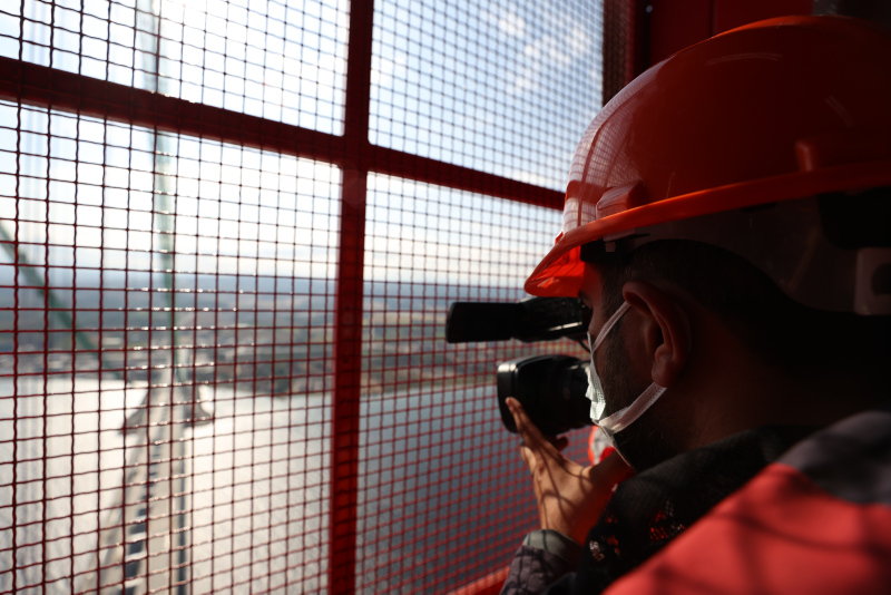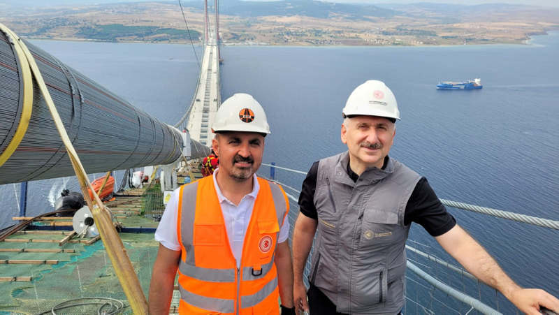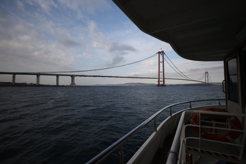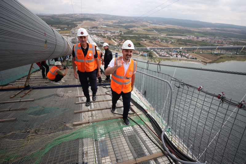 Çanakkale Boğazı'nda Avrupa ve Asya kıtalarını ilk kez birbirine bağlayacak 1915 Çanakkale Köprüsü'ne, her biri 45 metre genişliğinde, 48 metre uzunluğunda ve 700 ton ağırlığındaki 81 tabliye blokunun montajı tamamlandı. Avrupa ve Asya yakalarındaki 318 metre yüksekliğe sahip kulelerin ayaklarında, birbirine kaynatılmış bekleyen toplam 6 tabliyenin montajıyla araç geçiş yolu tamamlanmış olacak. Ulaştırma ve Altyapı Bakanı Adil Karaismailoğlu da basın mensuplarıyla 1915 Çanakkale Köprüsü kedi yolunda yürüyerek, Asya yakasından Avrupa yakasına geçti. Karaismailoğlu'nun gerçekleştirdiği ziyaret öncesi 1915 Çanakkale Köprüsü'nün Asya yakasındaki kulesine çıkan gazeteciler, çalışmaları 318 metre yükseklikten görüntüledi. İşte o kareler...