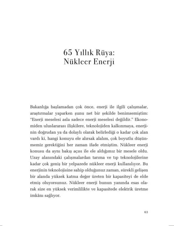 Nükleer Enerji Bakanlığa başlamadan çok önce, enerji ile ilgili çalışmalar, araştırmalar yaparken şunu net bir şekilde benimsemiştim: 'Enerji meselesi asla sadece enerji meselesi değildir.' Ekonomiden uluslararası ilişkilere, teknolojiden kalkınmaya, enerjinin doğrudan ya da dolaylı olarak belirlediği o kadar çok alan vardı ki, hangi konuyu ele alırsak alalım, çok boyutlu düşünmemiz gerektiğini her zaman ifade etmiştim. Nükleer enerji konusu da aynı bakış açısı ile ele aldığımız bir mesele oldu. Uzay alanındaki çalışmalardan tarıma ve tıp teknolojilerine kadar çok geniş bir yelpazede nükleer enerji kullanılıyor. Bu enerjinin teknolojisine sahip olduğunuz zaman, sürekli gelişen bir alanda yüksek katma değer üreten bir kapasiteyi de elde etmiş oluyorsunuz. Nükleer enerji bunun yanında esas olarak size en yüksek verimlilikte ve kapasitede elektrik üretme imkânı sağlıyor.