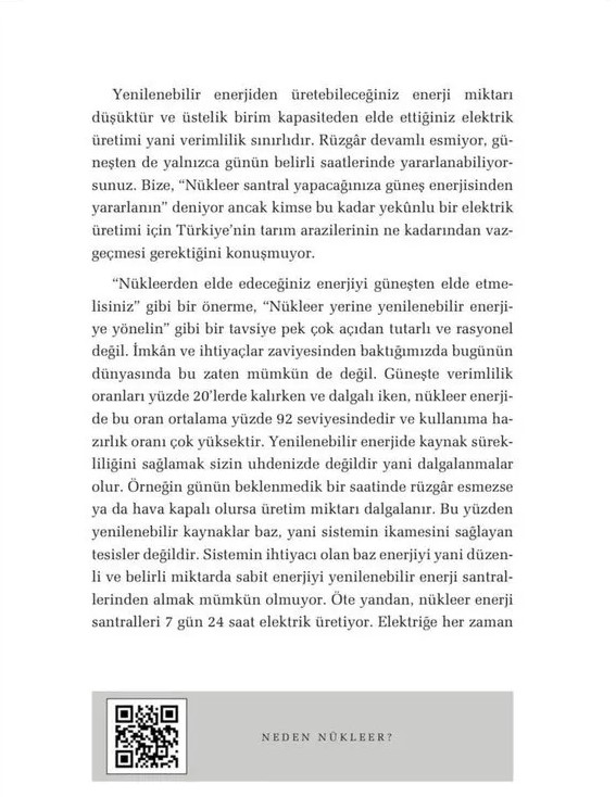 Yenilenebilir enerjiden üretebileceğiniz enerji miktarı düşüktür ve üstelik birim kapasiteden elde ettiğiniz elektrik üretimi yani verimlilik sınırlıdır. Rüzgâr devamlı esmiyor, güneşten de yalnızca günün belirli saatlerinde yararlanabiliyorsunuz. Bize, 'Nükleer santral yapacağınıza güneş enerjisinden yararlanın' deniyor ancak kimse bu kadar yekûnlu bir elektrik üretimi için Türkiye'nin tarım arazilerinin ne kadarından vazgeçmesi gerektiğini konuşmuyor.