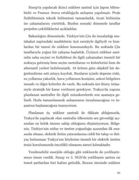 Bakanlığım döneminde, Türkiye'nin Çin ile imzaladığı mutabakat zaptındaki maddelerin üçü enerjiyle ilgiliydi ve bunlardan bir tanesi de nükleer konusundaydı. Bu noktada Çin taraflarıyla yoğun bir çalışma başlattık. Üçüncü nükleer santralin saha seçimi ve fizibilitesi ile ilgili çalışmaları önemli bir noktaya getirmiş hem seçim metotlarını ve kriterlerini hem de alternatif yerleri belirlemiştik. 19 kritere göre objektif bir değerlendirme seti ortaya koyduk. Bunların içinde deprem riski, su yollarına yakınlık, hava yollarının kesişimi, askeri bölgelere mesafe ve diğer kriterler de vardı. Bu noktada üst düzey istişareyle stratejik bir karar verilmesi gerekiyor. Trakya'da yapımı planlanan santraller ile ilgili müzakerelerde son aşamaya gelindi. Hızla tamamlanarak anlaşmanın imzalanacağına ve inşaatına başlanacağına inanıyorum.