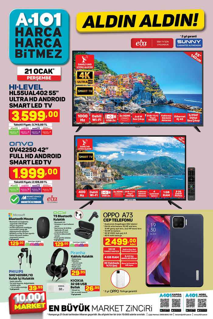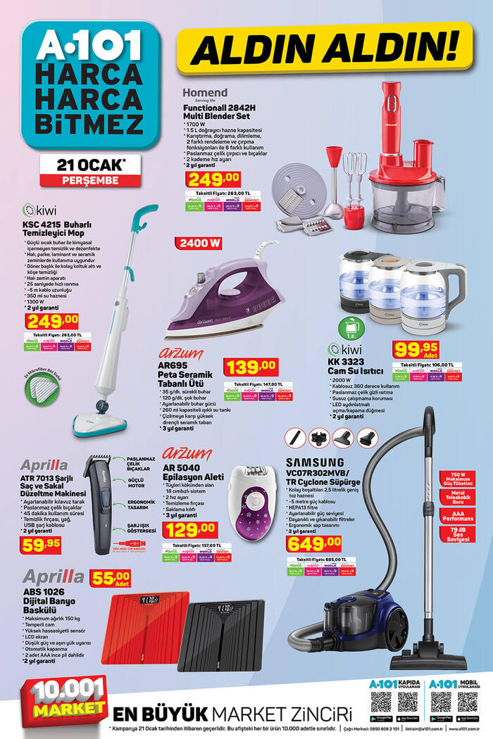 21 Ocak A101 aktüel ürünler kataloğu! Her hafta birbirinden çeşitli ürünlerin indirime girdiği A101 Aldın Aldın kampanyasının yeni kataloğu yayınlandı. A101 market zincirlerinin indirim kataloglarında bu hafta hem teknolojik aletler hem de mutfak eşyaları ön plana çıkıyor. İşte, 21 Ocak A101 aktüel ürünler kataloğu...