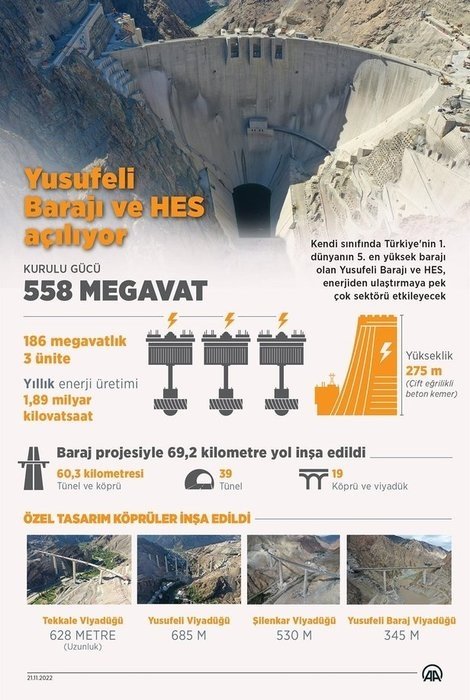 Toplam 275 metre yüksekliği ile Türkiye'nin en yüksek, "Çift Eğrilikli İnce Beton Kemer" kategorisinde ise dünyanın 5'inci yüksek barajı olan Yusufeli Barajı ve Hidroelektrik Santrali, Başkan Recep Tayyip Erdoğan'ın katıldığı tören ile su tutmaya başladı.