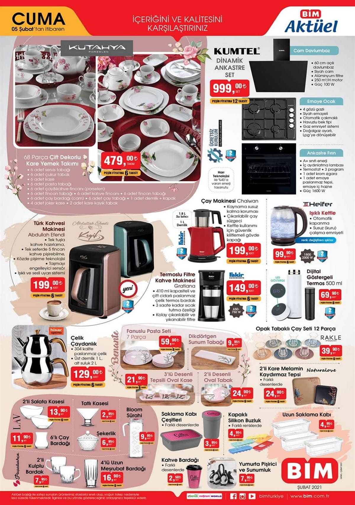 5 Şubat BİM aktüel ürünler kataloğu yayında. BİM aktüel ürünler kataloğunda bu hafta; yemek takımı seti, türk kahvesi makinası, ışıklı kettle gibi mutfak eşyalarının yanı sıra; şekerlik, tatlı kasesi, saklama kabı çeşitleri, oyun klavyesi, taşınabilir şarj aleti gibi herkesin merakla takip ettiği elektrik ve elektronik ürünler indirim kataloğunda yer alıyor. İşte, 5 Şubat BİM aktüel ürünler kataloğu ve BİM 5 Şubat aktüel ürünler kataloğu! Fırsatlar...