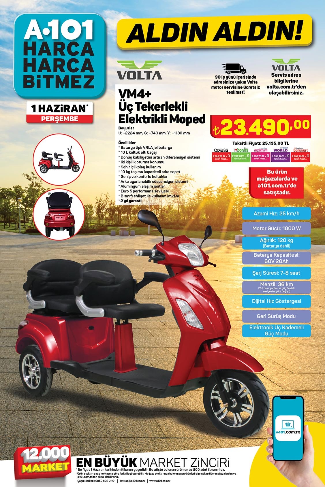 A101 zincir marketleri 81 ilde her hafta raflarına yeni aktüel ürünler ekliyor. Vatandaşlar tarafından yoğun ilgi görürken her türlü ihtiyaca göre de ürün bulunuyor. Öyle ki araç satışından tekneye kadar geniş ürün yelpazesi bulunuyor. A101 marketleri 81 ilde %100 elektrikli motosiklet perşembe günü satışa çıkarıyor. İşte detayları...