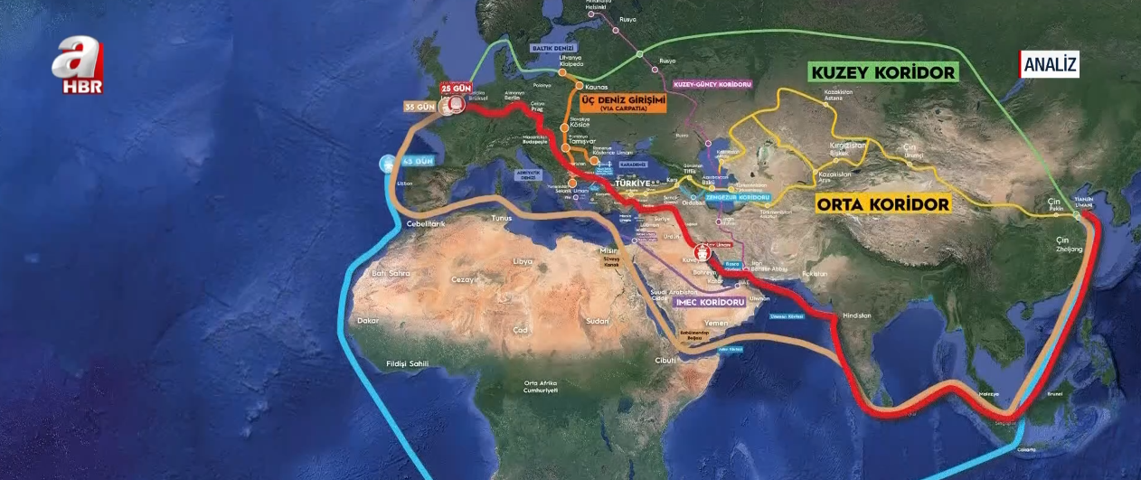 Türkiye, Çin'den Avrupa'ya uzanan Orta Koridor ve Körfez'i dünyaya bağlayan Kalkınma Yolu projeleriyle küresel ticarette dengeleri değiştiriyor. A Haber'e konuşan uzmanlar, Türkiye'nin doğu-batı ve kuzey-güney hattında en güvenli ve hızlı lojistik merkez haline geldiğini vurguladı.