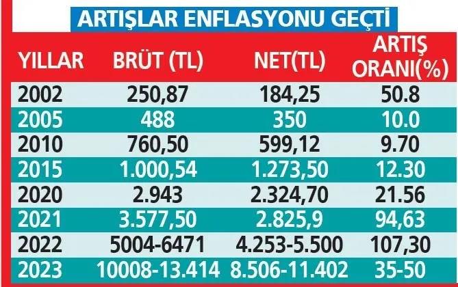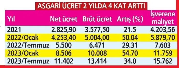 2022 Aralık ayında 5500 TL olarak uygulanan asgari ücret 2023 Ocak ve Temmuz aylarında yapılan artışla yüzde 107 artışla 11.402 TL'ye yükseldi. Asgari ücret dönemin kuruyla 482 dolar düzeyine çıkarak döviz bazlı rekor kırdı.