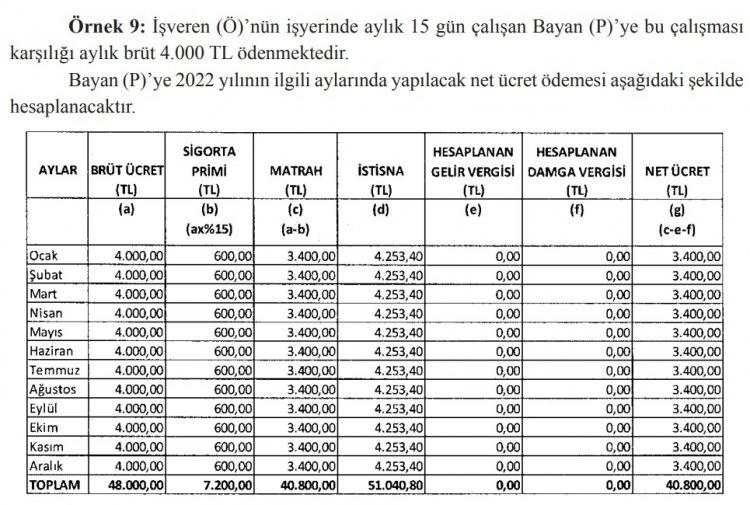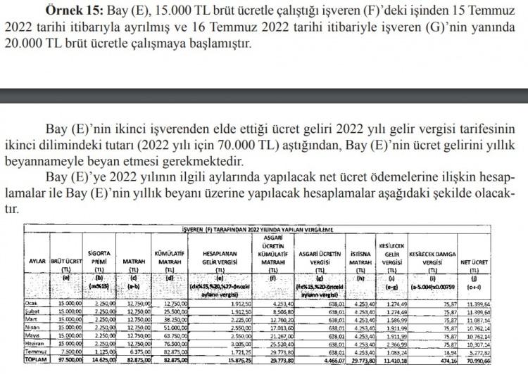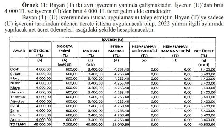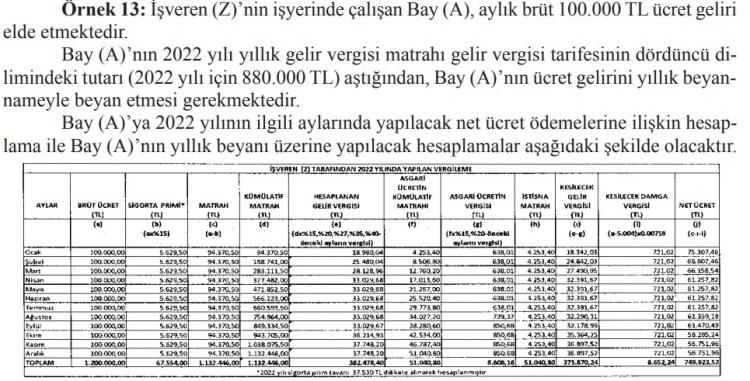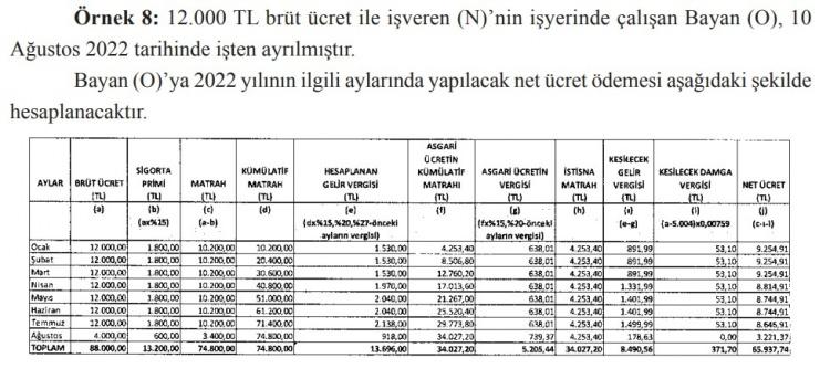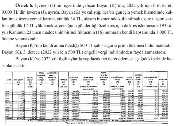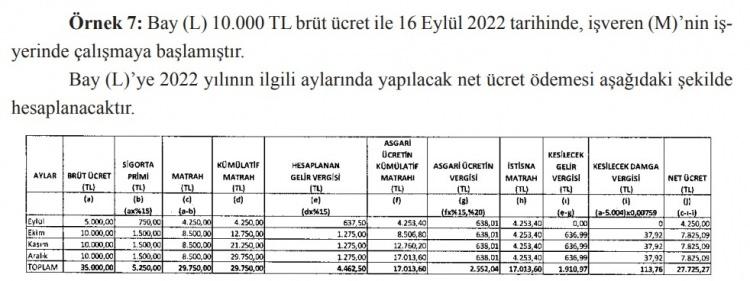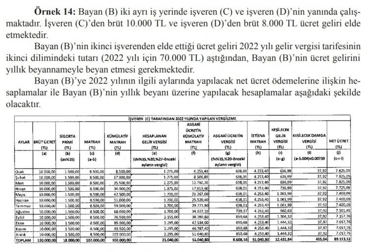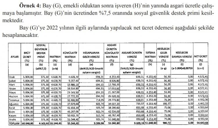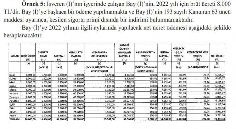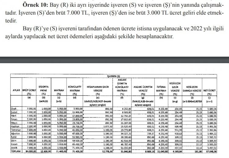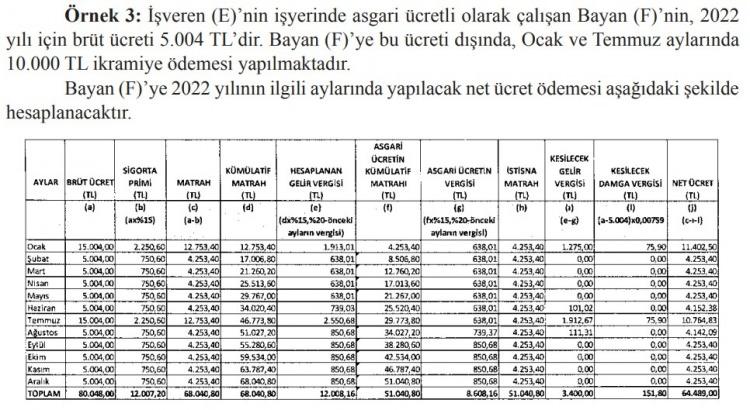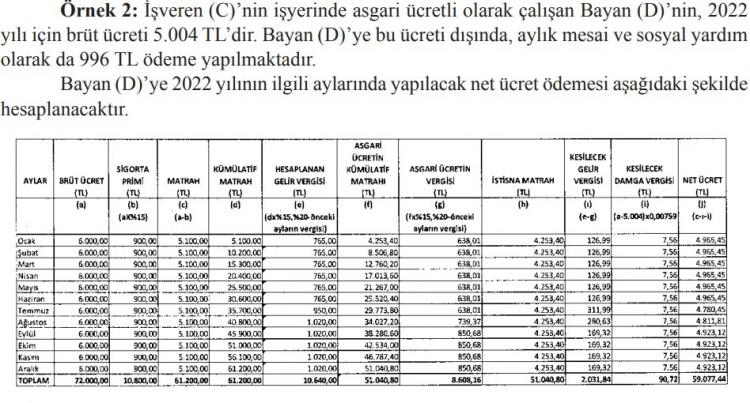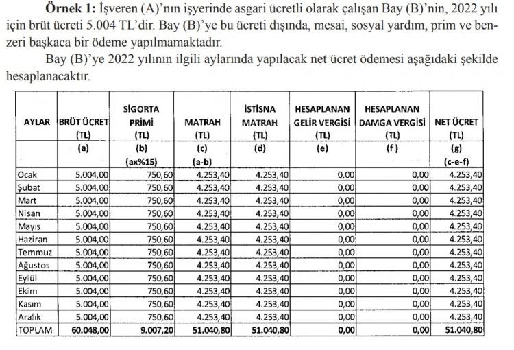 İşveren (A)'nın işyerinde asgari ücretli olarak çalışan Bay (B)'nin, 2022 yılı için brüt ücreti 5.004 TL'dir. Bay (B)'ye bu ücreti dışında, mesai, sosyal yardım, prim ve benzeri başkaca bir ödeme yapılmamaktadır. Bay (B)'ye 2022 yılının ilgili aylarında yapılacak net ücret ödemesi yukarıdaki şekilde hesaplanacaktır. Hizmet erbabının asgari ücretiyle birlikte mesai ücreti, sosyal yardım, ikramiye gibi ücret sayılan gelirler elde etmesi durumunda ise toplam ücret gelirinin; ilgili ayda geçerli olan asgari ücretin aylık brüt tutarından işçi sosyal güvenlik kurumu primi ve işsizlik sigorta primi düşüldükten sonra kalan kısmı gelir vergisinden istisna olacak, bu tutarı aşan kısım vergilendirilecektir. İstisna tutarını aşan kısmın vergilendirilmesinde, istisna kapsamında olan matrah da dikkate alınarak vergi tarifesinin uygulanacak dilim ve vergi oranı belirlenecektir. İstisna suretiyle sağlanan menfaat asgari ücretin ilgili ayda hesaplanan vergisini geçemeyecektir
