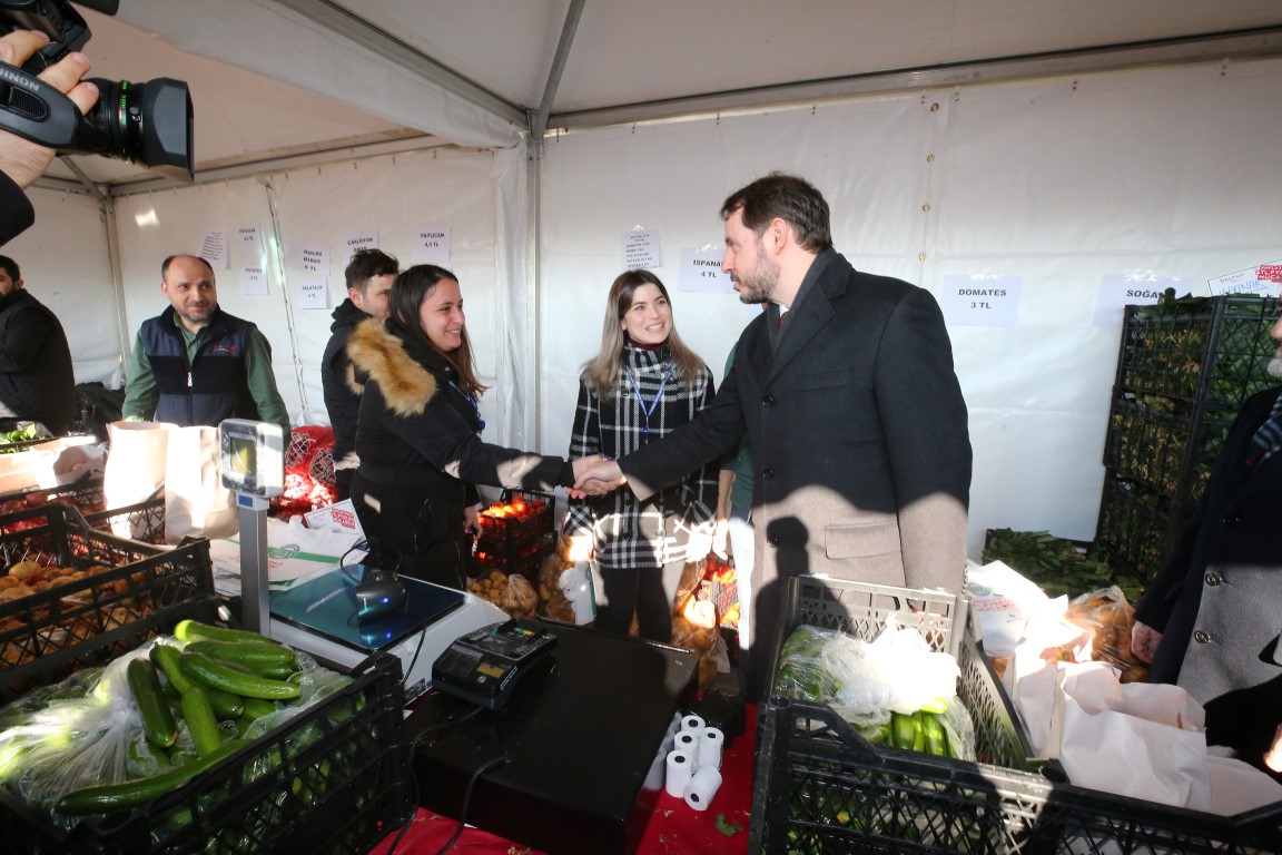 Ziyarette Bakan Albayrak, Üsküdar Belediye Başkanı Hilmi Türkmen ve İstanbul Büyükşehir Belediye (İBB) Başkanı ve AK Parti Büyükçekmece Belediye Başkan adayı Mevlüt Uysal vatandaşların aldığı sebze ve meyveleri paketledi.
