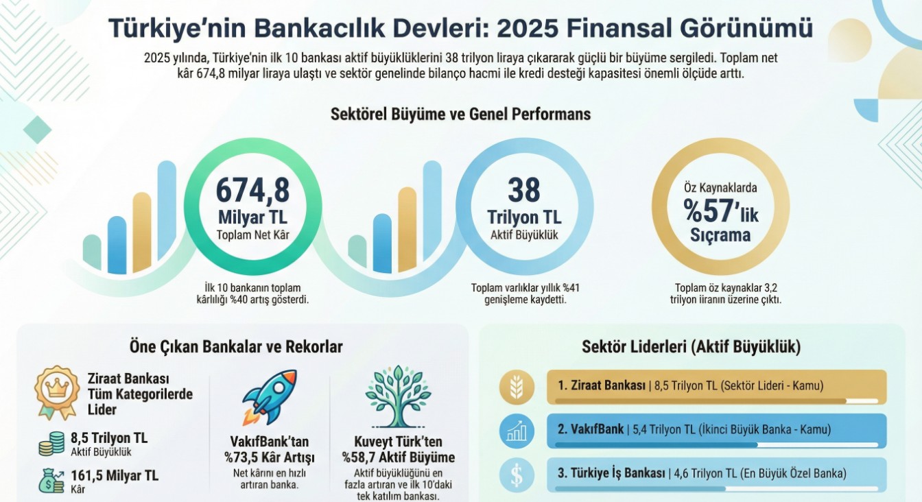 Türkiye'nin aktif büyüklüğü en yüksek 10 bankası, 2025'te toplam 674,8 milyar lira net kar elde ederken aktiflerini 38 trilyon liraya taşıdı. Konsolide olmayan finansal verilere göre mevduat 24,8 trilyon, kredi hacmi ise 20,5 trilyon lirayı aştı. Peki zirvede hangi banka var, en hızlı büyüyen kim oldu?