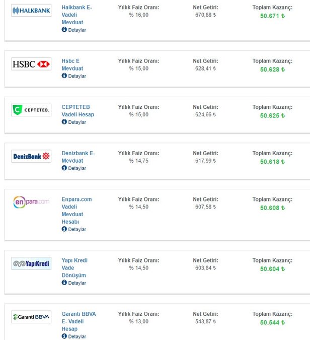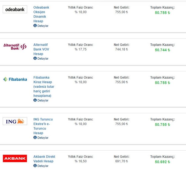 Bankada 50.000 TL'si olanlar için 32 günlük faiz kazanç tablosu...