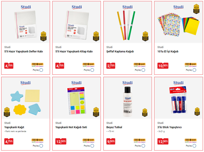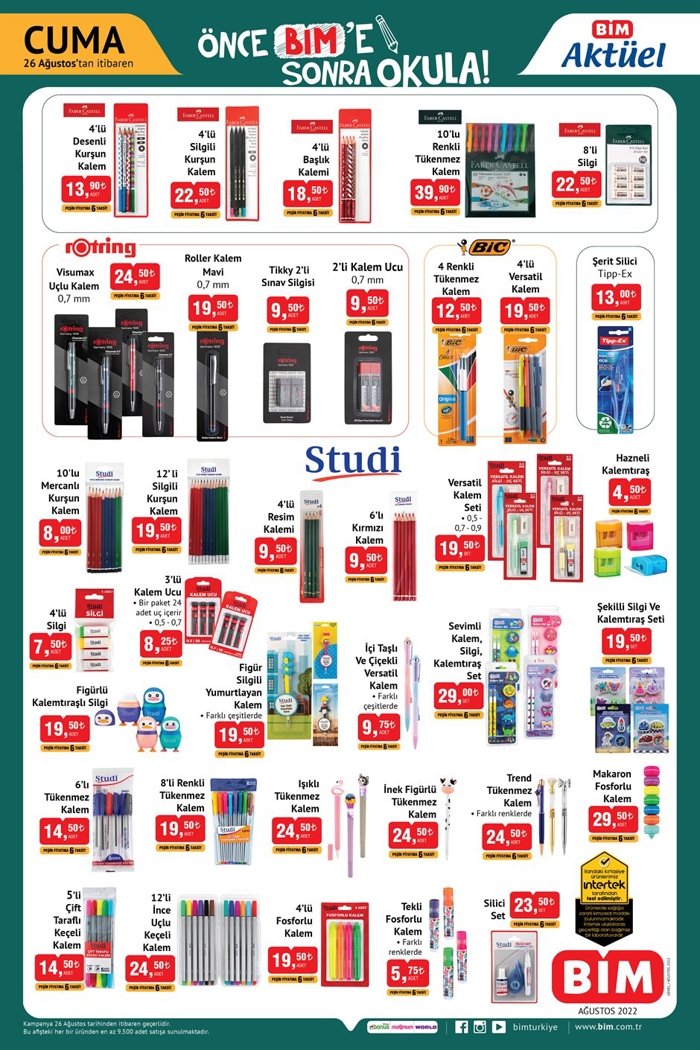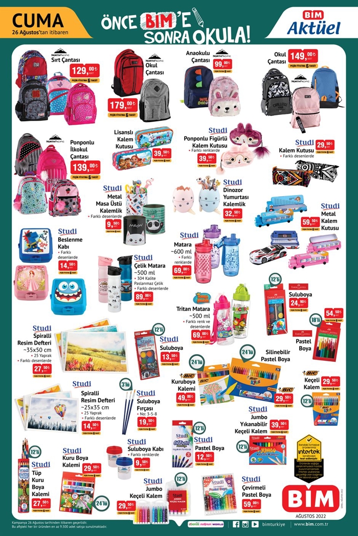 BİM'de bu hafta; Studi Taşlı ve Sulu Tükenmez Kalem Çeşitleri 24,50 TL, Studi Pelüşlü ve Simli Özel Seri Defter 59,00 TL, Pelüş Anaokulu Çantası 99,00 TL fiyatıyla dikkat çekiyor.