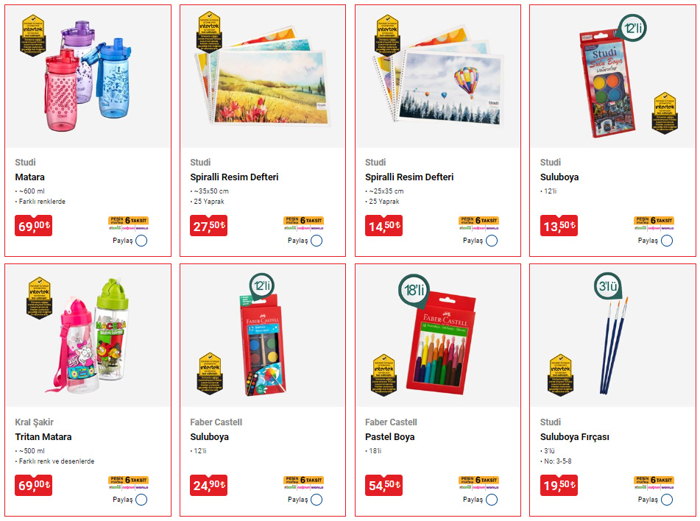 Ayrıca Faber Castell 4'lü Desenli Kurşun Kalem 13,90 TL, Faber Castell 12'li Sulu Boya 24,90 TL, Faber Castell 10'lu Renkli Tükenmez Kalem 39,90 TL fiyatıyla Cuma gününden itibaren BİM Market reyonlarında müşterilerin alımına sunulacak.