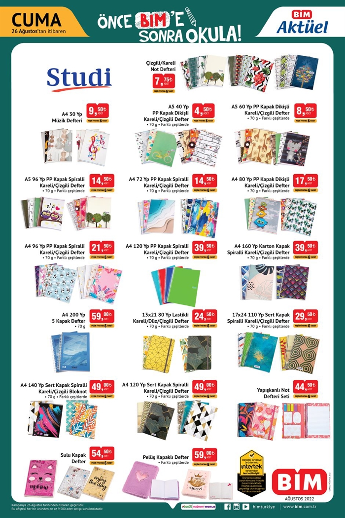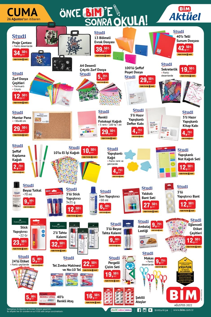 BİM'de bu hafta müşterinin beğenisine sunulan aktüel ürünler kataloğunda Teknoloji defter, kalem, boya, A4 kağıdı, dosya, okul çantası ve kırtasiye setleri yer alıyor. 26 Ağustos BİM kırtasiye ürünlerinin satışı eylül ayının ortasına kadar devam edecek. İşte 26 Ağustos 2022 Cuma BİM kırtasiye ürünleri kataloğu...